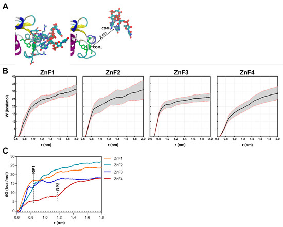 Results obtained from the sMD procedure on each of MBNL1’s ZnFs-RNA systems. (A) Representative snapshots of the initial (left) and final (right) coordinates of the sMD pulling process. The CCCH motif of each ZnF is colored green. (B) Cumulative work profiles for each ZnF vs. distance from the COM (r) between ZnF and RNA ligand. Black and red lines represent the mean and the 95% confidence interval. (C) Potential of Mean Force (PMF) for each ZnF extracted from the mean work profile. RP1 and RP2 correspond to the observed rupture points.