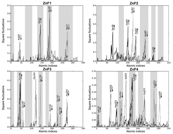 Local fluctuations extracted from the SMD simulations at four equally distributed segments of the trajectory. The binding process fluctuations (reversed SMD trajectory) are represented in light gray (unbound) to black lines (bound). Only the atomic indices of the RNA binding site are represented (ZnF1: 18 to 38; ZnF2: 52 to 72; ZnF3: 184 to 204; and ZnF4: 218 to 238). The most relevant fluctuations that increase or decrease during the binding process are indicated with an arrow. Grayed regions are not involved in the RNA-binding process.