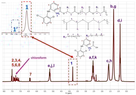 The analysis of 1H NMR spectra showed that the obtained reaction mixture consists of three substances—3-hydroxyfatty acid oligomers modified with diclofenac, unmodified oligomers, and a small amount of unreacted drug (Figure 1). As we have shown in previous work, it is possible to distinguish signals originating from diclofenac chemically bound to oligomers via an ester bond (Figure 1, signal 1) and the remaining unreacted compound (Figure 1, signal 1′) []. The signal at a shift of 3.78 ppm corresponds to the hydrogen of the methylene group, which is adjacent to the ester group connecting the drug molecule to the 3-hydroxyalkanoate oligomers. In turn, the signal at a shift of 3.85 ppm corresponds to the hydrogens of the free non-bonded diclofenac methylene group. Calculations using Equation (1) showed that 1 g of the resulting mixture contains only 3.7 mg of unreacted diclofenac, while 226 mg of the drug is covalently bound to the oligomers. Moreover, the use of a catalyst, which is also a factor in the decomposition of the polymer, significantly reduces the oligomer population’s molecular weight and dispersity (Table 1, Figure A1 and Figure A2).