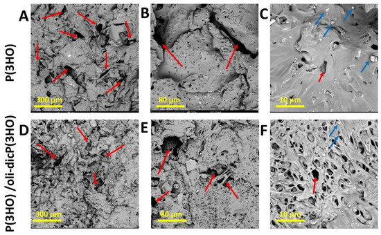 SEM image (A–C) of P(3HO) foams; (D–F) of P(3HO)/oli-dicP(3HO). View (A,D) ×220; (B,E) ×1000; (C,F) ×5000. In the figure, red arrows mark the pores, and blue arrows mark the grains of unleached salt.