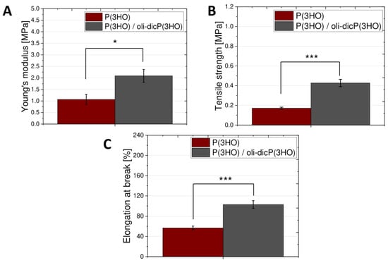 An additional requirement for a modern wound dressing is its appropriate mechanical properties, which provide adequate stability, flexibility, softness, and elasticity to cover the entire wound surface during healing []. The effect of the addition of diclofenac-modified oligomers on the mechanical properties, i.e., Young’s modulus (Figure 4A), tensile strength (Figure 4B), and elongation at break (Figure 4C) of the prepared foams were evaluated in this work. The addition of modified oligomers caused an increase in all the parameters mentioned above compared to foams made of P(3HO) polymer. Young’s modulus, tensile strength, and elongation at break for P(3HO)/oli-dicP(3HO) and P(3HO) foams were: 2.09 ± 0.28 MPa, 0.43 ± 0.04 MPa, 102.95 ± 7.53% and 1.07 ± 0.22 MPa, 0.17 ± 0.01 MPa, 51.98 ± 3.83%, respectively.