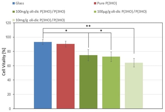 The cytotoxic assessment of P(3HO) enriched with different concentrations of diclofenac-modified oligomers (oli-dicP(3HO)) on MEF3T3 cells. Glass substrate was used as negative control. The results are statistically significant, where * p < 0.05, ** p < 0.001.