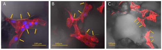 Microscopic images showing cells’ arrangement along the edges of the pores (orange dashed lines and arrows—placed inside the pore). The actin cytoskeleton is visualised in red (A–C) and cell nuclei (A,B) in blue. Panels A and B present images captured under 40× objective, panel C was imaged using a smaller (10×) magnification to exhibit a group of cells localised on the substrate.