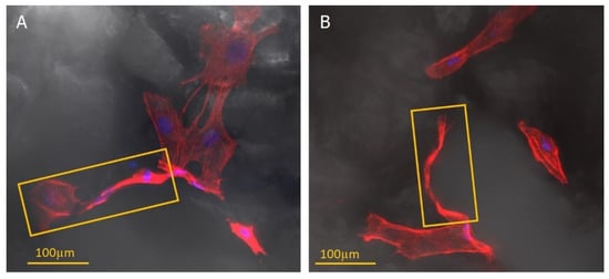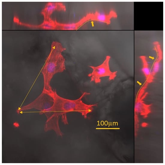 A confocal microscope imaged the fixed fibroblast cells on porous patches. The objects of observation were actin fibres, the nuclei, and the prepared materials’ structure. Three-dimensional reconstructions made it possible to analyse the arrangement of cells and their elements (e.g., filopodia) in the structures created inside the material. Cells’ tendency to align along the edge of the pores (Figure 6 and Figure 7) was observed. Additionally, the cells had a more elongated, spindle-like, and branched shape, and stress fibres were less visible (Figure 8). This observation is consistent with previous literature reports [,]. Moreover, physical parameters such as substrate rigidity and topography are essential for cell behaviour [,]. Research shows significant differences in the morphology of cells grown on 1D, 2D, and 3D substrates. It is assumed that cells feel the multidimensionality of their environment [], and significant differences in cytoskeleton morphology can be found between 2D environments, where actin filaments are visible and organised, and 3D environments, in which the number and visibility of fibres are reduced. Actin is pushed to the Lateran borders of the cell extensions []. Another phenomenon observed was cluster-like structures created by the cells inside the pores. Fibroblast cells spread filopodia on the edge of the material, allowing the built structure to hang over empty spaces in the substrate (Figure 9). A reduced tendency to form a monolayer was also noted in favour of this type of growth. Literature reports that the fibroblasts grown on porous scaffolds with pores with a diameter between 10 μm and 90 μm created a monolayer after nine days of culturing [] which is completely different from their behaviour on flat surfaces []. Cells tend to occupy the space inside the material’s pores, overgrowing them, which may indicate that the type of scaffold presented in this work may be suitable for producing functionalised absorbable tissue regeneration dressings. Literature reports indicate considerable interest in this product and technology [,,,]. The additional use of biodegradable and biocompatible materials in their production makes it possible to produce a new generation of dressing materials. This new product not only will not require invasive removal from the patient’s body, but also, thanks to its functionalisation with anti-inflammatory drugs, it will not exert negative pressure by preventing induction, for example, of inflammatory processes at the site of implantation.