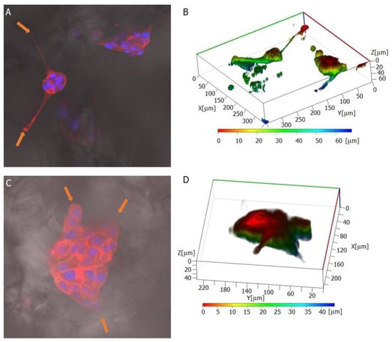 Cluster-like cell structures imaged in fluorescent mode (A,C) and 3D image reconstructions showing the spatial distribution of cell bodies (B,D). Cell attachment points at the pore edges are marked with orange arrows.