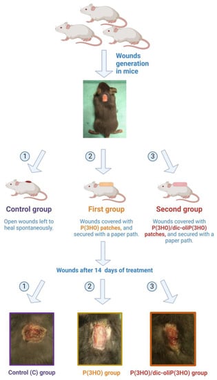 Mice are the most widely used experimental model in wound-healing research. This is related to accessibility, as well as ease of maintenance, standardisation, and cheapness. Therefore, this model allows using a relatively high number of animals for statistic validation. In our study, 48 adult male mice of the C57BL/6 strain were divided into three study groups: (1) control (C); (2) P(3HO), and (3) P(3HO)/oli-dicP(3HO) (Figure 10). No complications related to the created wounds were observed in any study group (i.e., no weight loss, rapid/altered breathing (tachypnoea), loss of appetite, reduced physical activity, signs of marked pain or discomfort, unexpected vocalisation, wound exudation, etc.). Animals normally moved around the cage as well as ate and drank when they woke up after surgery.
