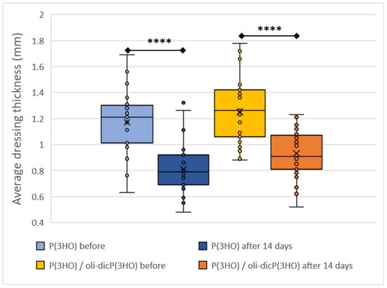 Comparison of average dressing thickness before operation and after 14 days of wound healing. Test: One-way ANOVA with post hoc Bonferroni’s multiple comparisons test, alpha 0.05 (95% confidence interval). Box plot showing the median (horizontal line); X (mean value). The box covers values from the first to the third quartile and the whiskers cover the total range. Significant digits (*) for p-value **** 0.0001.