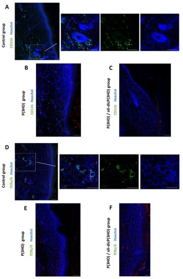 As can be seen in Figure 12, on day 14 of wound healing, in the injured area, only in the control group are positive CD11b (Figure 12A) and TCRγ/δ (Figure 12D) cells visible. For the wounds treated with P(3HO) and P(3HO)/oli-dicP(3HO) dressings, these cells were not observed (Figure 12B,C,E,F). These results confirm no infiltration of cells associated with developing inflammation in the examined tissues.