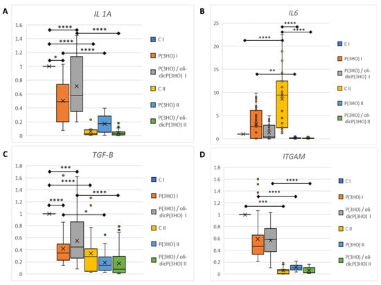 Relative gene expression of pro-inflammatory (IL1, IL6) (A,B) and anti-inflammatory cytokines (TGF-β) (C), as well as fibrocytes (ITGAM) (D), from the damaged tissue and the surrounding area on days 7 (I) and 14 (II). Test: One-way ANOVA with post hoc Bonferroni’s multiple comparisons test, alpha 0.05 (95% confidence interval), significant digits (*) for p-value * 0.0332, ** 0.0021, *** 0.0002, **** 0.0001. The plot shows the median (horizontal line), where X represents the mean value, the box covers values from the first to the third quartile, and whiskers represent the total range.