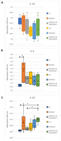 Average absorbance values of pro-inflammatory (IL1, IL6) (A,B) and anti-inflammatory cytokines (IL10) (C) in serum were obtained from mice’s peripheral blood on days 7 (I) and 14 (II). Test: One-way ANOVA with post hoc Bonferroni’s multiple comparisons test, alpha 0.05 (95% confidence interval), significant digits (*) for p-value * 0.0332. The box plot shows the median (horizontal line), where X represents the mean value, the box covers values from the first to the third quartile, and the whiskers represent the total range.