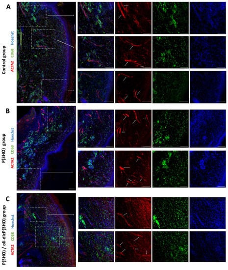 Confocal microscope photos show new blood vessels (ACTA2, red marked with white arrows) present in the healed area in control (A), P(3HO) (B) and P(3HO)/oli-dicP(3HO) (C) group and numerous CD68-positive cells (green). Scale bars—100 µm.
