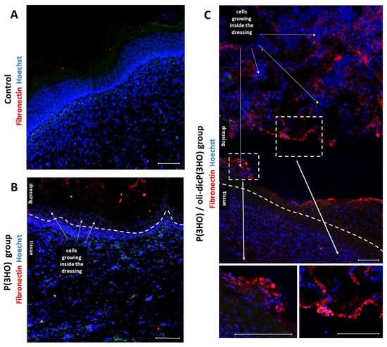 Confocal microscope images showing cells growing inside dressings—cell nuclei (Hochest (blue))—marked with white arrows (B,C), as well as fibronectin deposition (red) present in the healed tissue and P(3HO)/oli-dicP(3HO) dressing (C). Control group on picture (A). Scale bars—50 µm.