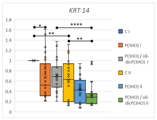 The expression of Krt14 gene coding cytokeratin 14—a marker of highly proliferative keratinocyte stem cells localised to the basal layer of the epidermis—was also checked. These cells divide and move outward toward the skin surface/wound edge after injury. While moving toward the skin surface, they differentiated and lost their Krt14 expression []. From the evaluation of Krt14 expression at the mRNA level, we can conclude that its levels decrease over time, especially in the control and P(3HO)/oli-dicP(3HO) group (Figure 17). This is reasonable, because in the initial stage of wound healing, new keratinocytes are needed, and after 14 days, they migrate, differentiate, and lose Krt14 expression. Interestingly, a lower expression of the Krt14 gene in the P(3HO) group (on day 7) and the P(3HO)/oli-dicP(3HO) group (on day 14) compared to the control was observed.
