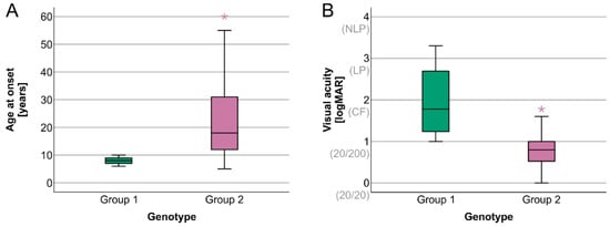 Boxplot chart showing the distribution of the ages at the onset of visual symptoms and visual acuities (VAs) in the two patient groups. Group 1 patients presented a significantly later age of onset (A) and significantly better VA (B). Horizontal lines represent median values, boxes represent half of the patients, and whiskers represent the remaining data, except in the case of the outliers (stars). LogMAR = logarithm of the minimum angle of resolution.