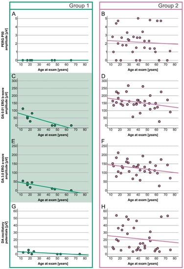 Age-dependent decrease (linear regression) in PERG P50 amplitude and DA ERG responses in Group 1 (A,C,E,G) and 2 (B,D,F,H) patients. Group 1 is marked with green and Group 2 with purple. Green-colored graphs represent a significant correlation between age and DA 0.01 ERG b-wave and DA 3.0 ERG a-wave amplitudes.