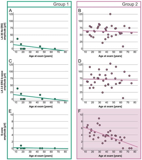 Age-dependent decrease (linear regression) in LA ERG responses in Group 1 (A,C,E) and 2 (B,D,F) patients. Group 1 is marked with green and Group 2 with purple. The purple-colored graph represents a significant correlation between age and S-cone ERG amplitude.