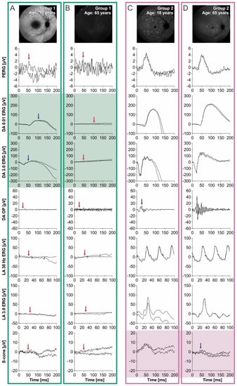 ERG responses from two younger and two older representative patients from each group. Panels (A,C) show responses from an 18- and 65-year-old patient from Group 1, while panels (B,D) show responses from an 18- and 65-year-old patient from Group 2. Detectable but abnormal responses are marked with blue arrows, while undetectable responses are marked with red arrows. A fundus autofluorescence image of the macula is shown for each patient in the top-right corner. Note that the DA 0.01 ERG b-wave and DA 3.0 ERG a-wave were only detectable in the 18-year-old patient from Group 1 (A) and no responses were detectable in the 65-year-old patient from the same group (D). In comparison, all responses were detectable in both the 18- and 65-year-old patients from Group 2 ((B) and (D), respectively) with, however, a notable difference in the S-cone response.