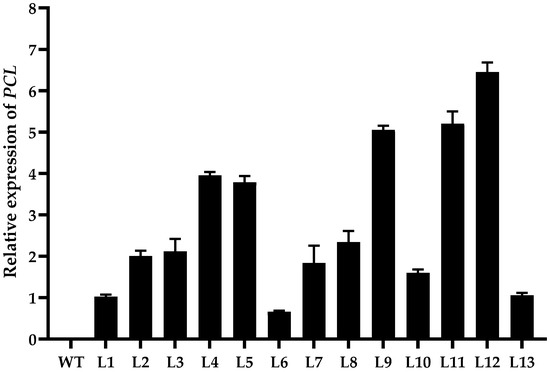 PCL transcript levels between different lines. WT: wild-type. L1–L13: PCL transgenic lines of Nicotiana nudicaulis.