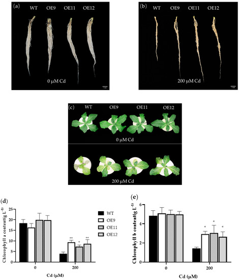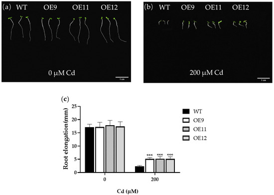 We measured the root length of seedlings after germination under 0 or 200 μM Cd2+. Seeds of wild-type (WT) and the three homozygous transgenic lines (OE9, OE11, and OE12) were sown under 0 or 200 μM Cd2+ for 3 d. The results showed that the effect of Cd on root growth was evident. Under control conditions, there was no apparent difference between WT and transgenic tobacco (Figure 2a). When treated with 200 μM Cd2+, the root and leaf growth of transgenic and WT plants was inhibited, but the inhibition of transgenic plants was much lower than that of WT (p < 0.01; Figure 2b,c).