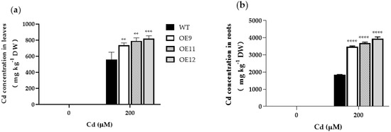 To investigate the effects of PCL expression on Cd concentration, we determined the Cd content in the leaves and roots of transgenic and WT tobacco. Under control conditions, the Cd concentration level in transgenic and WT tobacco was very low and showed no significant difference (Figure 4a,b). Under 200 μM Cd2+, the leaf accumulation in WT plants was 24.1–31.6% less (OE9 and OE11, p < 0.01; OE12, p < 0.001) than in transgenic lines (Figure 4a). The Cd accumulation in the roots of transgenic plants was about 1.8–2.2 times that of WT (p < 0.0001; Figure 4b). The results showed that transgenic plants had a superior capacity to chelate Cd, and accumulated Cd in roots to higher levels than in aboveground parts.
