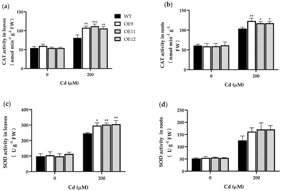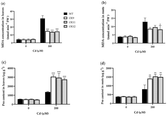 MDA and Pro content under 0 or 200 μM Cd in wild-type (WT) and transgenic tobacco plants (OE9, OE11, and OE12). (a) MDA content in leaves (b) MDA content in roots. (c) Pro content in leaves (d) Pro content in roots. Data represent the means ± SD (n = 3). Asterisks indicate a significant difference between the transgenic lines and the WT (*, p < 0.05; **, p < 0.01; ***, p < 0.001).