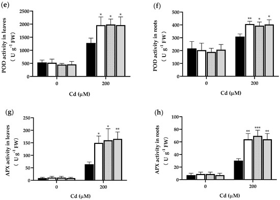 Leaf samples were collected after seven days of Cd treatment, washed with distilled water, and immersed in 1% DAB (50 mM Tris-HCl, pH 3.8) and 0.5 mg mL−1 NBT (25 mM HEPES, pH 7.8) for 6 h in the dark. The leaves were then transferred to anhydrous ethanol and bathed in boiling water for about 10 min until the chlorophyll disappeared utterly [42].