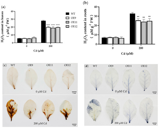 H2O2 content, DAB, and NBT staining under 0 or 200 μM Cd in wild-type (WT) and transgenic tobacco plants (OE9, OE11, and OE12). (a) H2O2 content in leaves. (b) H2O2 content in roots. (c) DAB staining. (d) NBT staining. Data represent the means ± SD (n = 3). Asterisks indicate a significant difference between the transgenic lines and the WT (**, p < 0.01; ****, p < 0.0001).