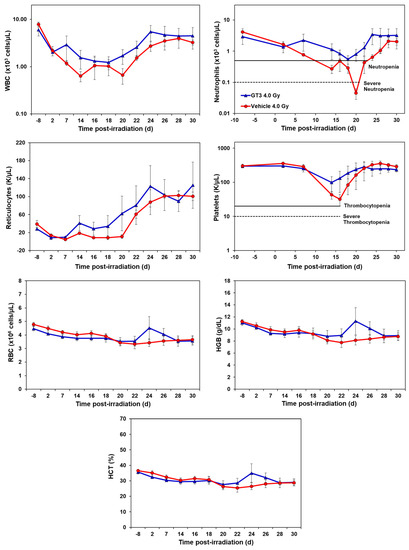 Effects of GT3 on complete blood count (CBC) in NHPs exposed to 5.8 Gy TBI. NHPs received GT3 (37.5 mg/kg) or vehicle 24 h prior to irradiation. Peripheral blood was collected at various time points. Cells were counted utilizing a Bayer Advia-120 cell counter. Data are expressed as mean ± SEM. * The difference between GT3- and vehicle-treated groups was significant when equal variance between groups was assumed (* p < 0.05).