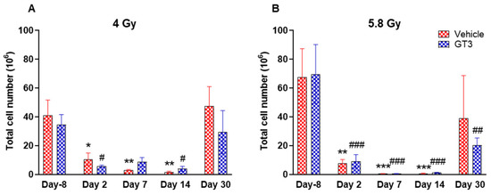 A progressive decrease in the total number of WBC counts was observed in vehicle- and GT3-treated groups post-irradiation (Figure 3A,B). However, these numbers returned to normal by day 30 in both groups at 4 Gy (Figure 3A), and in the vehicle-treated group at 5.8 Gy (Figure 3B). These changes were statistically significant on days 2, 7 and 14 in vehicle-treated groups (74 to 96% decrease, p < 0.05 and p < 0.01), and on days 2 and 14 in GT3-treated groups (84 to 88% decrease, p < 0.05) when compared with day -8 at 4 Gy. These changes were more prominent at 5.8 Gy at all time points when compared to day -8 in the vehicle-treated groups except on day 30 (88 to 99% decrease day -8, p < 0.01 and p < 0.001) and in GT3-treated groups (71 to 99% decrease, p < 0.001 and p < 0.01) (Figure 3B). However, no statistical difference was observed between vehicle- and GT3-treated groups across the time points (Figure 3A,B).