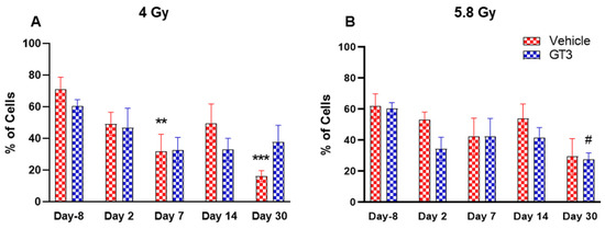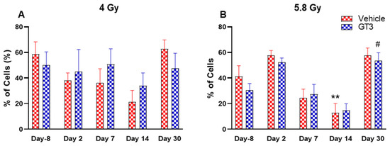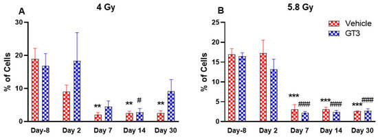 BM cells were labeled with CD45, a transmembrane protein tyrosine phosphatase located on most hematopoietic cells [44,45]. As shown in Figure 4A,B, radiation doses of 4 and 5.8 Gy TBI induced a decrease in hematopoietic cells in both vehicle- and GT3-treated groups. These changes were noted to be significant at day 7 and 30 in the vehicle-treated group at 4 Gy (compared to day-8, p < 0.01, p < 0.001, respectively) (Figure 4A). However, no significant differences were observed between vehicle- and GT3-treated groups across time points in both irradiated groups.