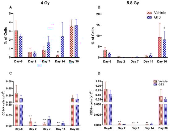 Effects of 4 and 5.8 Gy on CD34 percentages (A,B) and total cell counts (C,D) in BM of NHPs. NHPs received GT3 (37.5 mg/kg) or vehicle 24 h prior to irradiation (4 and 5.8 Gy). BM was collected at various time points and expression of CD34+ cells (A,B) and total number (C,D) were analyzed. Data are expressed as mean ± SEM. * p < 0.05, ** p < 0.01 vs. vehicle day-8; # p < 0.05 vs. GT3 day-8.