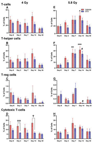 Effects of 4 and 5.8 Gy on T-cell (A,E), T-helper cell (B,F), T-reg cell (C,G), and cytotoxic T-cell (D,H) expression in BM of NHPs. NHPs received GT3 (37.5 mg/kg) or vehicle 24 h prior to irradiation (4 and 5.8 Gy). BM was collected at various time points, and the expression of T+ cells and their subsets were analyzed. Data are expressed as mean ± SEM. * p < 0.05, ** p < 0.01, *** p < 0.001 vs. vehicle day-8; # p < 0.05 vs. GT3 day-8; † p < 0.05, †† p < 0.01, vehicle vs. GT3 at Day 2 and 14.