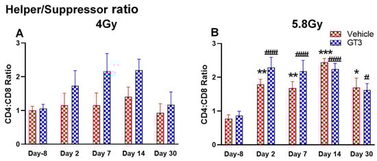 Effects of 4 Gy (A) and 5.8 Gy (B) on CD4:CD8 ratio in BM of NHPs. NHPs received GT3 (37.5 mg/kg) or vehicle 24 h prior to irradiation (4 and 5.8 Gy). BM was collected at various time points and the expression of the CD4:CD8 ratio was analyzed. Data are expressed as mean ± SEM. * p < 0.05, ** p < 0.01, *** p < 0.001 vs. vehicle day-8; # p< 0.05, ### p< 0.001 vs. GT3 day-8.