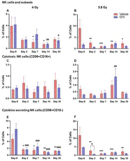 Natural killer (NK) cells are important cells of the innate immune system that are involved in the early defense against foreign and virally transformed cells. Neural cell adhesion marker (N-CAM), CD56, is a marker to define NK cells in humans and NHPs, which consist of 2–12% of the lymphocyte population [41,51,52]. In this study, CD3−CD56+ cells were considered as NK cells. Time- and dose-dependent changes were observed in the percentage of NK cells, which were greatly reduced in vehicle-treated animals post-irradiation. These changes were statistically significant on days 7 and 14 at 4 Gy (p < 0.05), and at all time points at 5.8 Gy when compared with day-8 (p < 0.01, p < 0.001, p < 0.01, p < 0.05, respectively) (Figure 9A,B). However, in the GT3-treated group, a significant decrease was observed only on days 14 and 30 at 4 Gy (Figure 9A) (p < 0.01 and p < 0.05, respectively), and no significant difference was observed in 5.8 Gy treated animals compared to day-8 (Figure 9B). The delayed radiation-induced effect on the percent of NK cells at 4 Gy and no significant difference at 5.8 Gy may be linked to GT3-mediated protection.