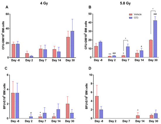 Effects of 4 Gy (A) and 5.8 Gy (B) on CD45 expression in BM of NHPs. NHPs received GT3 (37.5 mg/kg) or vehicle 24 h prior to irradiation (4 and 5.8 Gy). BM was collected at various time points and expression of CD45+ cells were analyzed. Data are expressed as mean ± SEM. ** p < 0.01, *** p < 0.001 vs. vehicle day-8; # p < 0.05 vs. GT3 day-8.
