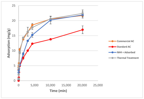 Adsorption kinetics of the chromium (VI) were obtained using the 30 min 550 °C thermally-treated petroleum coke activated carbon, the 30 min 550 °C ammonium chloride adsorbed activated carbon and the commercial activated carbon. Times of 5 min, 10 min, 30 min, 1 h, 2 h, 6 h, 24 h, 48 h, 72 h, 1 week, and 2 weeks were tested; 0.1 g of activated carbon was added for adsorption and all samples were allowed to stir for their respective time at a stirring speed of 150 rpm before being filtered using a 0.45 μm filter and analyzed on the MP-AES for chromium quantitation.