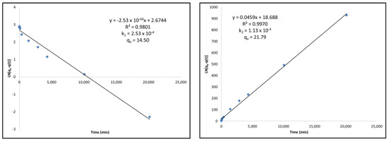 Finally, the thermally-treated activated carbon follows a pseudo-second-order model more accurately than the pseudo-first-order model. The linearity in the pseudo-second-order model is much greater, the qe value calculated from the model is much more accurate than that which was determined in the kinetics experiment, and the k2 adsorption rate constant is lower than the k1 determined from the pseudo-first-order model. Figure 4 shows an example of the pseudo-first-order and pseudo-second-order modeling for commercial activated carbon. All other kinetic modelings can be found in Appendix B, Figure A1, Figure A2 and Figure A3.
