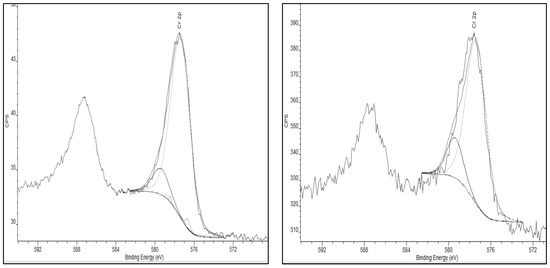 Measurement of XPS spectra was made on an AXIS Supra spectrometer (Kratos, Spring Valley, New York, NY, USA). A monochromatic AlKα source (15 mA, 15 kV) was used with the instrument work function calibrated to give a binding energy (BE) of 83.96 eV for the Au4f7/2 line for metallic gold. The spectrometer dispersion was adjusted to give a BE of 932.62 eV for the Cu2p3/2 line of metallic copper. The Kratos charge neutralizer system was used on all specimens and survey scan analyses were carried out with an analysis area of 300 × 700 microns with a pass energy of 160 eV. A pass energy of 20 eV with an analysis area of 300 × 700 microns was carried out for high-resolution analyses. Fitting of peaks was conducted using CASA XPS (version 2.31) with the spectra being corrected to the main line of the carbon 1s spectrum at 284.8 eV.