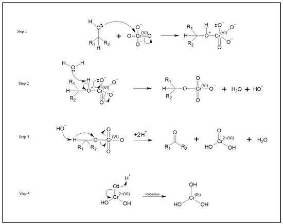 As previously mentioned, the proposed reaction above is very similar to the well-known Jones Oxidation reaction. The Jones Oxidation reaction mechanism is shown in Figure 8. When comparing these two mechanisms, steps 1 and 2 found in Figure 7 are very similar to step 1 found in Figure 8. The resulting product of these steps is a chromate ester. Similarly, step 3 found in Figure 7 is very similar to step 2 of Figure 8 where the result of the reaction is a ketone and the chromium (VI) species, CrO(OH)2. Finally, step 4 of Figure 7 is consistent with the “further steps” portion of the Jones Oxidation reaction found in Figure 8 where Cr (VI) is reduced to Cr (III). It is important to note that the Jones Oxidation reaction is an organic mechanism that focuses on the formation of ketone from alcohol. While the transformation of alcohol to a ketone is important, this study is more focused on the reduction of chromium (VI) to chromium (III).