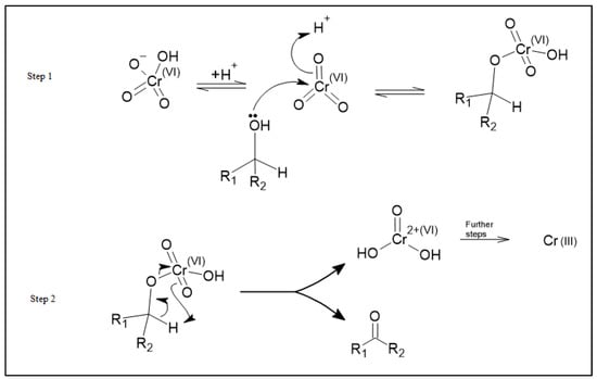 Based on these observed changes in oxidation states and the effect of thermal treatment of the carbon, we propose a redox adsorption process as shown in Figure 7. This process is similar to the known organic Jones Oxidation reaction mechanism for the reaction of HCrO4− with an alcohol where HCrO4− reacts with an alcohol to form a ketone and an unstable chromium VI species, CrO(OH)2. Further reactions then reduce this chromium (VI) species to Cr (III) [25].