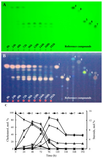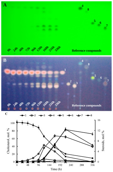 Cholesterol conversion by S. hirsuta in a mineral medium. (A) Identification under UV-light (254 nm). (B) TLC-plate staining with a MnCl2 solution followed by identification under UV light (365 nm). Each sample volume was 100 µL (A,B). (C) Kinetics of steroid products accumulation and cholesterol utilization (HPLC data). Designations: 1, cholesterol; 2, 26-hydroxycholesterol; 3, 3β-hydroxycholest-5-en-26-oic acid; 4, cholest-4-en-3-one; 5, 26-hydroxycholest-4-en-3-one; 6, 3-oxo-cholest-4-en-26-oic acid; 7, 3-oxo-cholesta-1,4-dien-26-oic acid; 8, cholesta-1,4-dien-3-one.