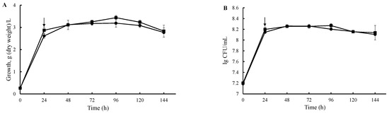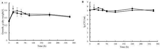 Growth of S. hirsuta in a rich (GSMY) medium. (A) S. hirsuta growth in a rich medium in the absence (circles) and presence of cholesterol (squares) (1.5 mM) measured by dry weight; (B) CFU count in the dynamics of incubation S. hirsuta in the rich medium in the presence of cholesterol (1.5 mM) (squares) or without steroids (circles). Arrows indicate the addition of cholesterol.