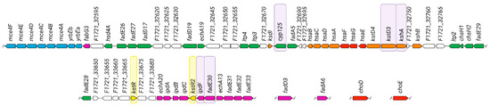 Organization of the S. hirsuta sterol catabolism gene cluster. Genes putatively involved in cholesterol catabolism are in green; genes related to the A/B-ring degradation are in red and orange; genes coding for C/D-ring degradation are in purple; genes coding for transport systems are in blue; and regulatory elements are in yellow. Five genes of interest are marked with light violet frames. The two transcriptional repressor genes kstR and kstR2 are marked with yellow frames (adopted from [15]).
