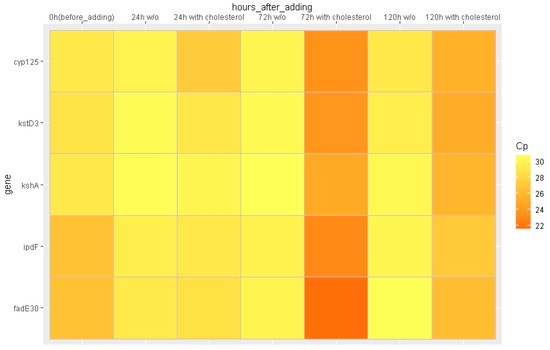 Heat map. The X-axis represents the sampling time for control and variant with cholesterol; the Y-axis represents the genes of interest. Crossing point (Cp) shows the cycle number for each gene of interest as normalized to the Cp of the 16S rRNA. Lower Cp values (higher expression) are brighter colors.