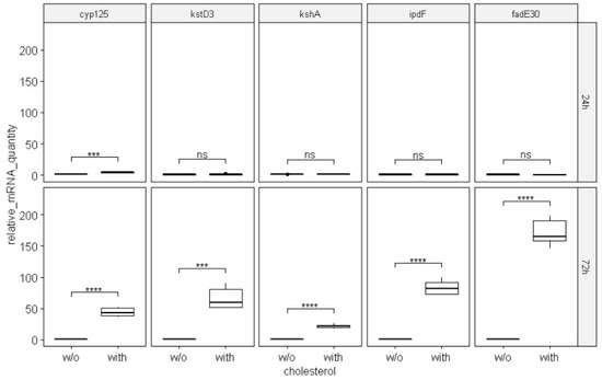 Relative mRNA quantities of the five genes of interest (normalized to the 16S rRNA amount) at 24 and 72 h of cholesterol induction. Designations: w/o, without; ns, p > 0.05; (***), p ≤ 0.001; (****), p ≤ 0.0001.