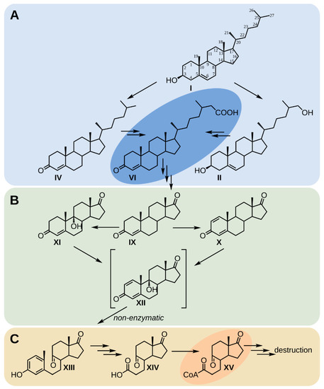 Principal scheme of cholesterol catabolism by mesophilic actinobacteria. (A) Dehydrogenation and isomerization of 3β-ol-5-ene to 3-keto-4-ene moiety in the steroid core A-ring and degradation of the sterol side chain to C19-steroid. (B) Steroid core B-ring opening via 9α-hydroxylation and 1(2)-dehydrogenation. (C) Steroid core degradation via the 9(10)-seco pathway. I, cholesterol; II, cholest-5-ene-3β,26-diol (26-Hydroxycholesterol); IV, cholest-4-en-3-one; VI, 3-oxo-cholest-4-en-26-oic acid, a KstR effector [32]; IX, androst-4-ene-3,17-dione (AD); X, androsta-1,4-diene-3,17-dione (ADD); XI, 9α-hydroxyandrost-4-ene-3,17-dione (9α-hydroxy-AD); XII, 9α-hydroxyandrosta-1,4-diene-3,17-dione (unsTable 9α-hydroxy-ADD); XIII, 3β-hydroxy-9,10-seco-androsta-1,3,5(10)-triene-9,17-dione (3-HSA); XIV, 9,17-dioxo-1,2,3,4,10,19-hexanorandrostan-5-oic acid (DOHNAA) or 3aα-H-4α-(3′-propanoate)-7aβ-methylhexahydro-1,5-indadione (HIP); XV, 9,17-dioxo-1,2,3,4,10,19-hexanorandrostan-5-oyl-CoA (HIP-CoA), a KstR2 effector.
