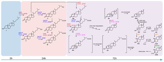 A scheme of the proposed involvement of the five genes of interest in cholesterol bioconversion by S. hirsuta. I, cholesterol; II, cholest-5-ene-3β,26-diol (26-hydroxycholesterol); III, 3β-hydroxy-cholest-5-en-26-oic acid; IV, cholest-4-en-3-one; V, 26-hydroxy-cholest-4-en-3-one; VI, 3-oxo-cholest-4-en-26-oic acid; VII, 3-oxo-cholesta-1,4-dien-26-oic acid; VIII, cholesta-1,4-dien-3-one; X, androsta-1,4-diene-3,17-dione (ADD); XII, 9α-hydroxyandrosta-1,4-diene-3,17-dione (unsTable 9α-hydroxy-ADD); XIII, 3β-hydroxy-9,10-seco-androsta-1,3,5(10)-triene-9,17-dione (3-HSA); XIV, 9,17-dioxo-1,2,3,4,10,19-hexanorandrostan-5-oic acid (DOHNAA) or 3aα-H-4α-(3′-propanoate)-7aβ-methylhexahydro-1,5-indadione (HIP); XV, 9,17-dioxo-1,2,3,4,10,19-hexanorandrostan-5-oyl-CoA (HIP-CoA); XVI, 9-hydroxy-17-oxo-1,2,3,4,10,19-hexanorandrostan-5-oic acid or 3aα-H-4α(3′-propanoate)-5α-hydroxy-7aβ-methylhexahydro-1-indanone (5-OH-HIP); XVII, 9-hydroxy-17-oxo-1,2,3,4,10,19-hexanorandrostan-5-oyl-CoA (HIP-CoA); XVIII—9-Hydroxy-17-oxo-1,2,3,4,10,19-hexanorandrost-6-ene-5-oyl-CoA (5-OH-HIPE-CoA); XIX, 9α-hydroxy-3-oxo-cholesta-1,4-dien-26-oic acid; XX, 3β-hydroxy-9-oxo-9,10-seco-cholesta-1,3,5(10)-triene-26-oic acid.