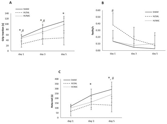 (A) Grip traction, (B) Foot-fault and (C) Rota-Rod test of SHAM-operated, HI/SAL and HI/NAC treated animals during the 3 days of observation period. Data are presented as mean ± SD. (*) p < 0.05 HI/SAL vs. SHAM group, (#) HI/SAL vs. HI/NAC group.