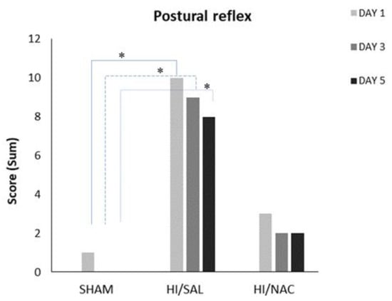 Lateral pressure: SHAM animals presented with normal reflex from day 1 (4/4), while HI/NAC animals improved from 3/7 in day 1 to 5/7 in day 5, although this difference did not reach statistical significance (Cochran’s Q test, p > 0.05). HI animals improved from 1/11 correct tests in day 1 to 3/11 in day 5, but this difference was not significant (Cochran’s Q test, p > 0.05). Pairwise comparisons for each day showed that SHAM animals significantly differed from HI/SAL (Chi-square, p < 0.05), while the difference between HI/NAC and either SHAM or HI/SAL did not reach statistical significance (Figure 3C).