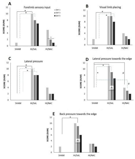 (A–E) Performance of SHAM, HI/SAL and HI/NAC groups in limb placing tests during the 3 days of the examination. (*) p < 0.05 HI/SAL vs. SHAM group, (#) p < 0.05 HI/NAC vs. SHAM group, (&) p < 0.05 HI/SAL day1 vs. day5, (^) p < 0.05 HI/NAC day1 vs. day5.
